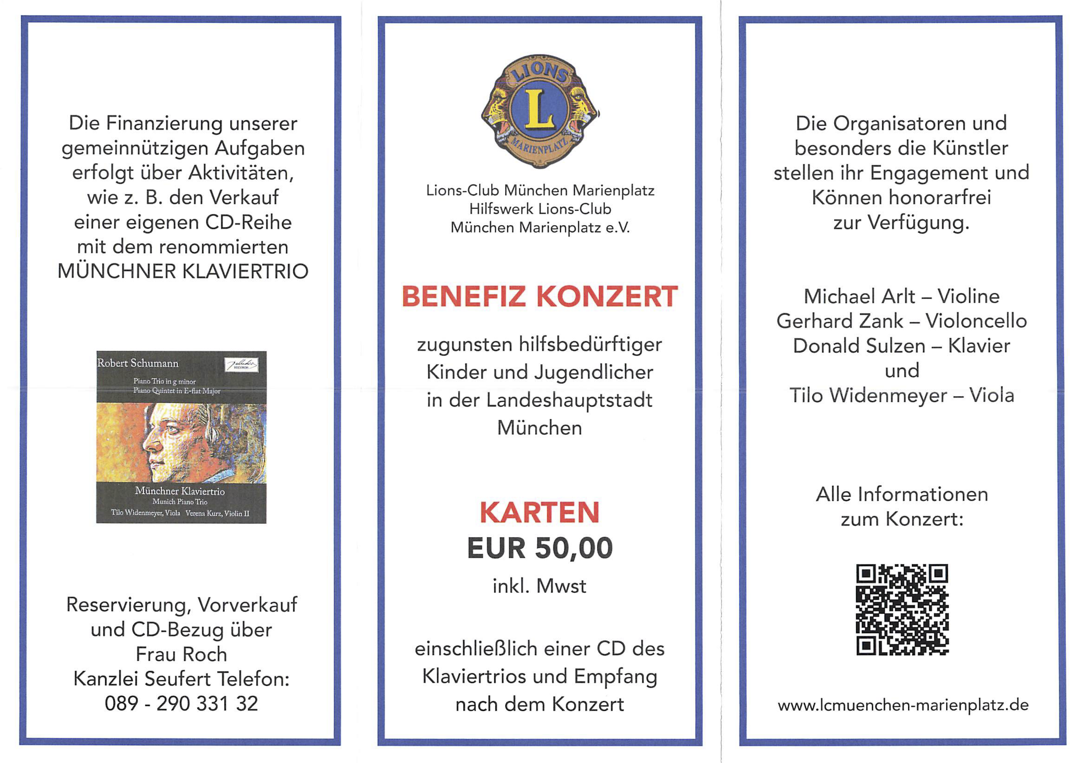 Das Benefizkonzert mit dem „Münchner Klaviertrio“, welches dieses Jahr am 8. November im Festsaal des Künstlerhauses am Lenbachplatz in München stattfindet, ist unser jährliches „Highlight“. Die Erlöse aus dem Konzert verwenden wir ausschließlich für unsere sozialen Projekte. Deshalb strengen wir uns jedes Jahr aufs Neue an, dass keiner der 400 Plätze frei bleibt. Die Karten kosten 50 Euro und beinhalten eine kostenlose CD des „Münchner Klaviertrios“. Außerdem lädt der Club im Anschluss an das Konzert traditionell zu einem Stehempfang ein. Das Konzert steht allen Interessierten offen (weitere Informationen finden Sie im untenstehenden Flyer)!